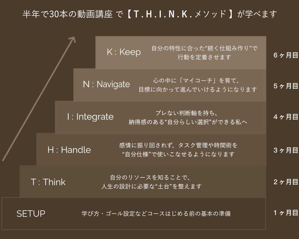 1000人以上の女性の人生をライフコーチとしてサポートしてきた西田みゆきがあなたのコーチとして、半年間伴走し、あなたが目標に向かって適切な選択をできるようになるセルフマネジメントの土台作りをお手伝いします。