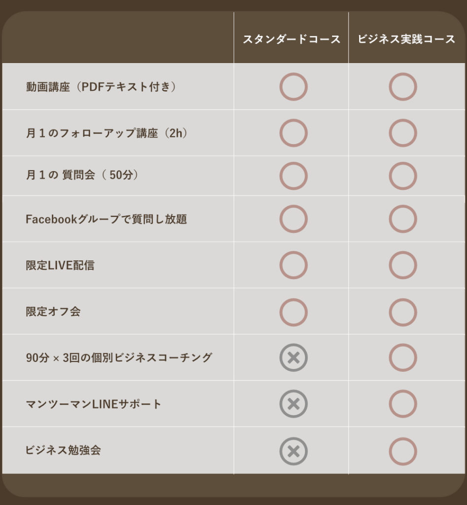 「スタンダードコース」で心の土台を整えたら行動や結果にも繋がる内容にはなっていますが、0 →1でビジネスを構築する場合や、一緒にSNS戦略を考えて欲しい場合は「ビジネス実践コース」をオススメします。